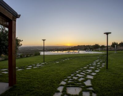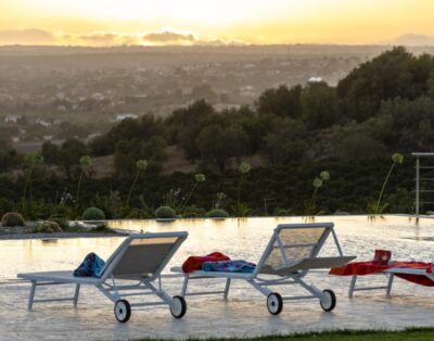 Eine moderne Designervilla mit weitem Panoramablick, einer E-Ladestation und umgeben von traumhaften Mandelbäumen.