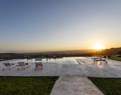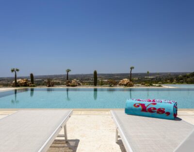 Eine stilsichere Ferienvilla bei Noto mit 12 m langem Salzwasserpool mit römischer Treppe, antike Olivenhaine und Meerblick.