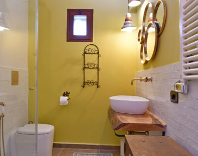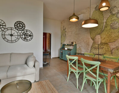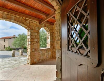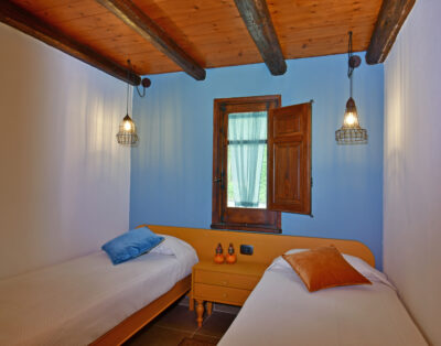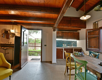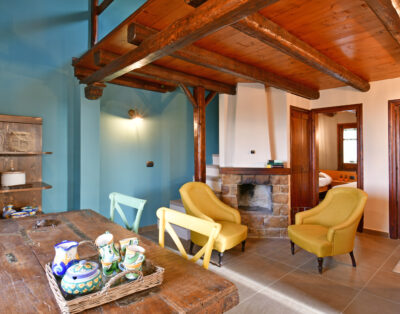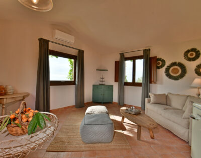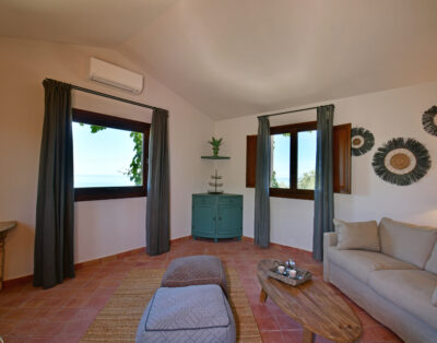 Der Innenbereich mit stilvollem Mobiliar wurde bis auf das kleinste Detail durchdacht. Im Hauptgebäude befindet sich im Erdgeschoss der schöne große und lichtdurchflutete Wohnraum mit gemütlichen Sofas, einem Essbereich, eine komplett ausgestatteten Küchenzeile. Die großen Panoramafenster mit Schiebetür führt zur Terrasse, für gemeinsame Abendessen wobei das herrliche Panorama Sie stets begleitet. Neben dem Wohnraum befindet sich ein Schlafzimmer mit Doppelbett und ein ensuite Badezimmer. Über eine Treppe erreichen Sie den ersten Stock der Villa mit zwei weiteren Schlafzimmern je mit Doppelbett und zwei ensuite Badezimmer (eines mit Dusche, das zweite mit Badewanne). Von den Schlafzimmern aus, genießen Sie ebenfalls den Blick auf das Meer.