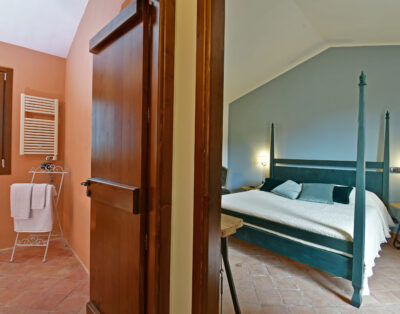 Schlafzimmer mit Doppelbett und ensuite Badezimmer / WC mit Dusche