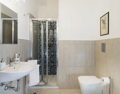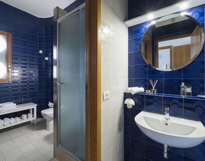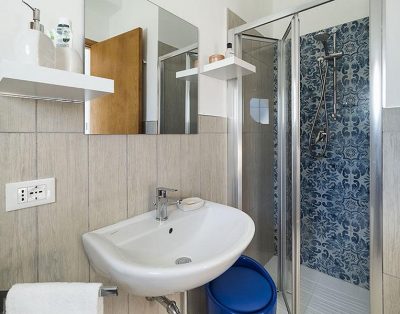 Dreibettzimmer mit Ehebett und Einzelbett und Bad mit Dusche